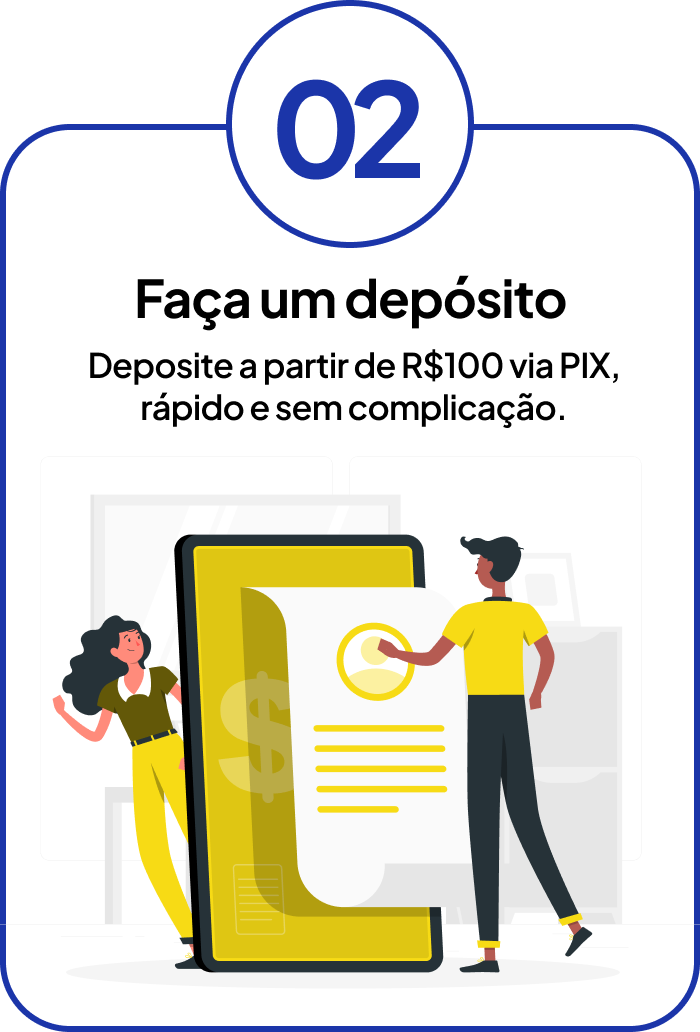 O depósito mínimo é de R$100, feito via PIX de forma imediata.
